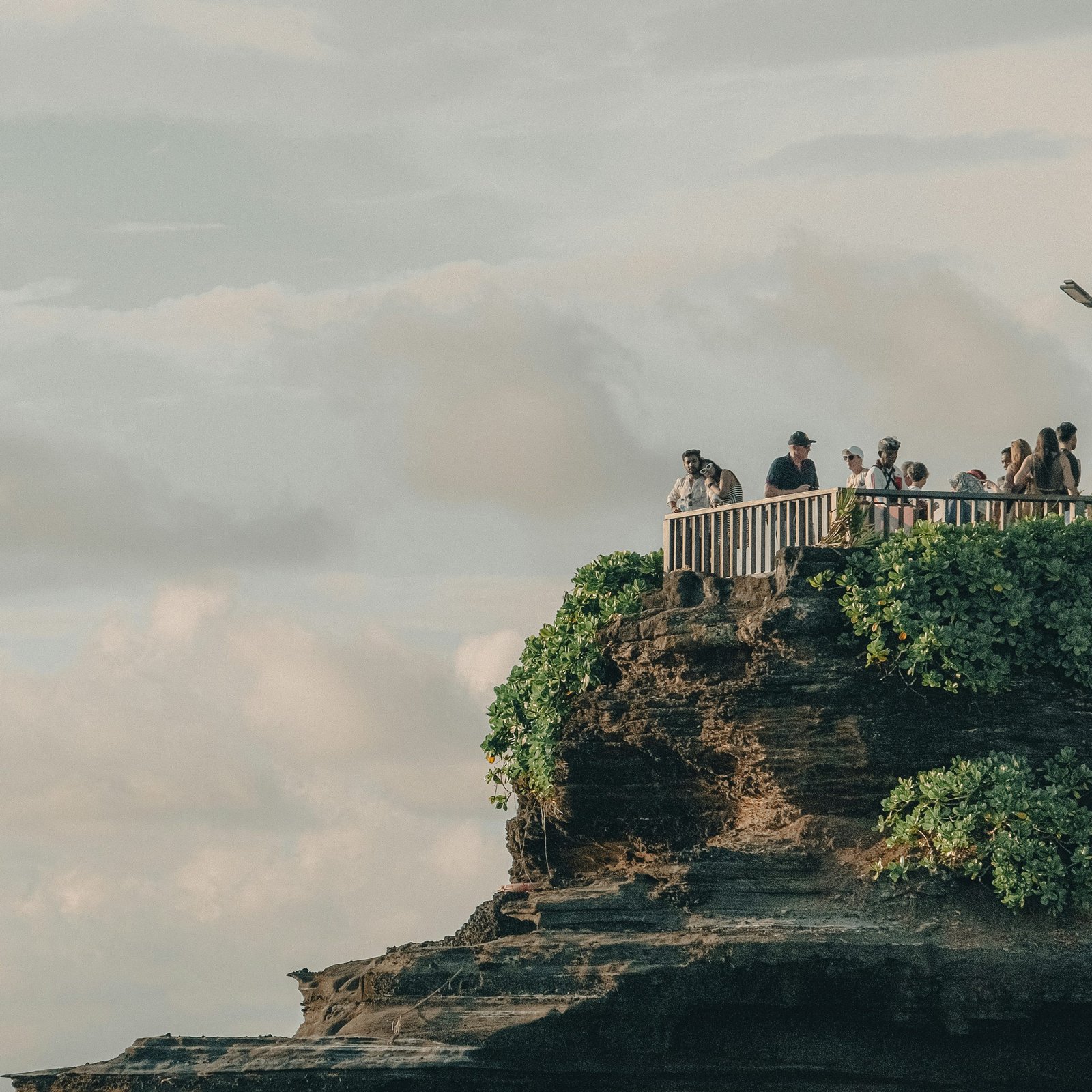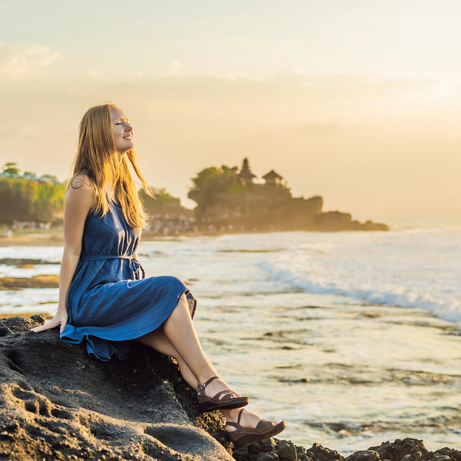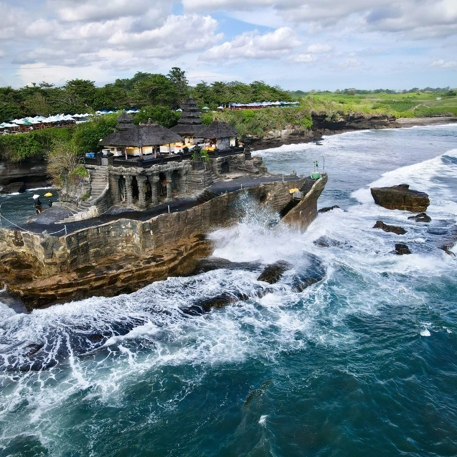 Walk the coastal paths and capture the classic Bali sunset as waves crash around the sea temple perched on its rock.