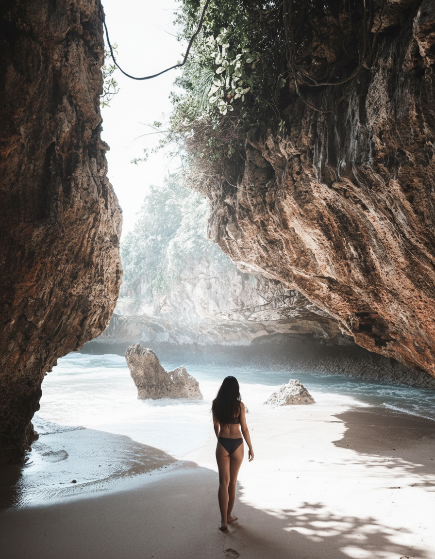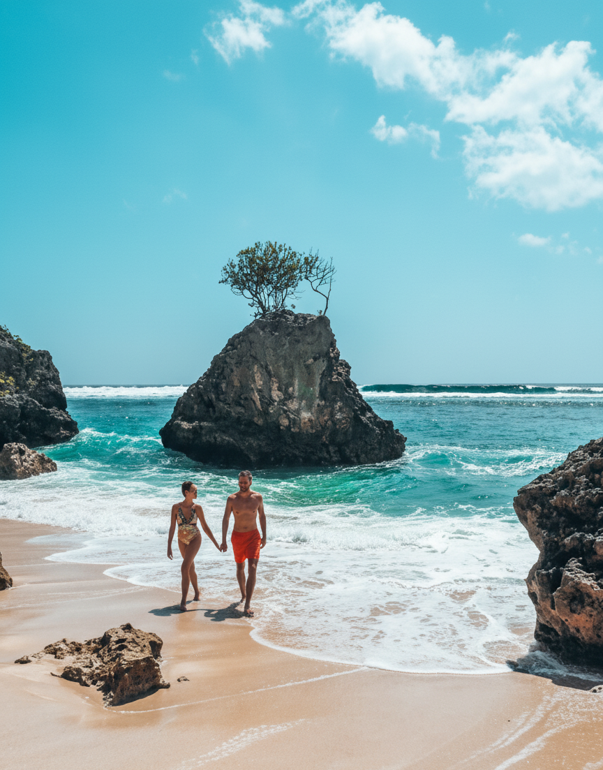 Relax at the beautiful Bingin Beach, known for its laid-back vibe, surf breaks, and stunning clifftop views overlooking the Indian Ocean.